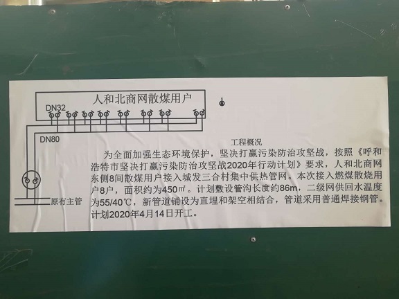 按照《呼和浩特市堅(jiān)決打贏污染防治攻堅(jiān)戰(zhàn)2020年行動(dòng)計(jì)劃》總體要求,該項(xiàng)目接入燃煤散燒用戶42戶,面積約2450平方米,其中一家村豐州路西34戶,2000平方米;人和北商網(wǎng)8戶,450平方米。該項(xiàng)目計(jì)劃敷設(shè)管線溝槽長(zhǎng)度約174米,其中一家村豐州路西為88米,人和北商網(wǎng)為86米。新管道鋪設(shè)以直埋和架空相結(jié)合的方式,全部采用普通焊接鋼管,開(kāi)工時(shí)間為2020年4月14日。