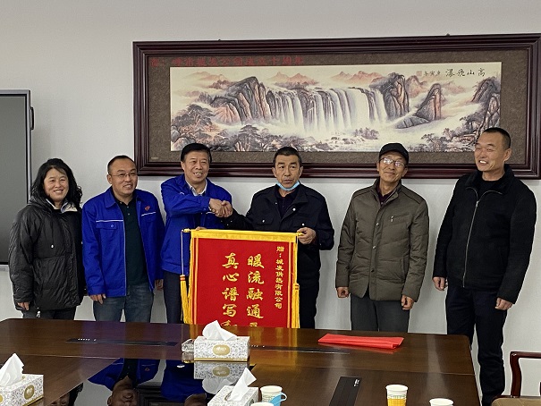 11月29日,西黑河村村長胡滿貴一行四人來到市城市燃熱集團(tuán)公司將一面寫著"暖流融通西黑河真心譜寫和諧曲"的錦旗贈(zèng)送呼市城發(fā)供熱公司,對城發(fā)供熱公司用心盡力,精心施工,保障供暖,傾情服務(wù)表達(dá)了誠摯的謝意!集團(tuán)公司總工程師胡月在鄭重地接過這份來自村民的認(rèn)可。