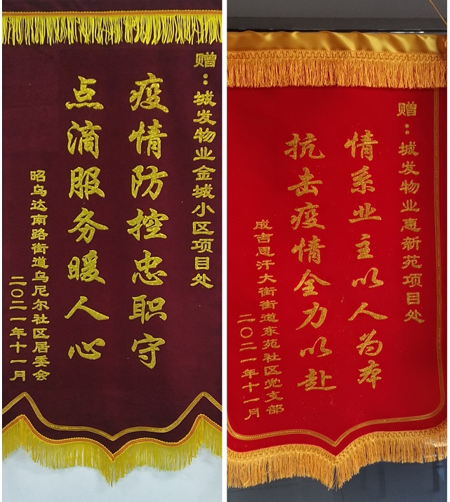 2021年城發(fā)物業(yè)公司年度取得了可喜成績,2021年被呼和浩特市物業(yè)管理協(xié)會評為2021年度先進單位、管理的金城小區(qū)項目被呼和浩特市物業(yè)管理協(xié)會評為2021年度呼和浩特市物業(yè)管理示范項目,史濤、郝曉東、范宇昆、董美麗四名同志被呼和浩特市物業(yè)管理協(xié)會評為2021年"抗議勇士"與"最美物業(yè)人","金城小區(qū)"、"陽光美居"、"惠新苑"項目處分別被賽罕區(qū)烏尼爾社區(qū)居委會、富力社區(qū)、新城區(qū)東苑社區(qū)居委會贈送"疫情防控忠值守,點滴服務(wù)暖人心"錦旗和榮譽證書。