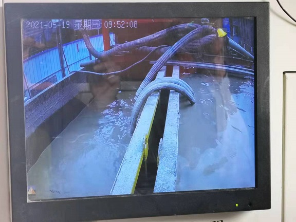 在頂管操作室,可以從電子顯示屏上清晰看到井底施工的畫面,狹窄的空間里兩名個人不停的用鐵鍬將設(shè)備挖出的沙土推到水里混合。