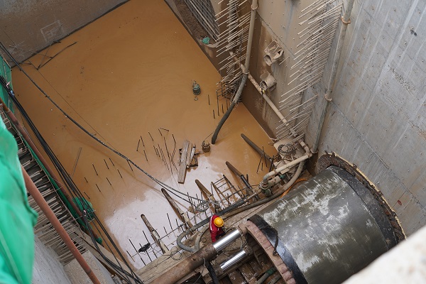 施工現(xiàn)場機(jī)器轟鳴,說話需要提高分貝。一進(jìn)入施工現(xiàn)場,就看到前方有一個沉井,沉井20米深、13.4*7.3米間方,這個沉井是挖掘井,在河的對岸還有一個深15.5米的接收井。從沉井圍欄邊看井底,下邊的工作人員都顯得特別的渺小,20米深的井相當(dāng)于6層樓高,恐高的人都不敢往下看。